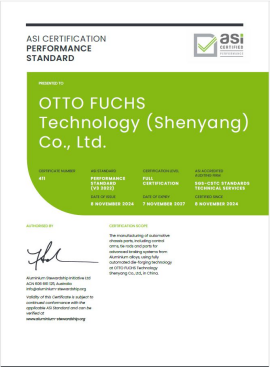 Aluminium Stewardship Initiative (ASI) announced on November 28 that OTTO FUCHS Technology Shenyang Co., Ltd. has been certified against the ASI Performance Standard (PS) V3 (2022).